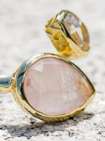 雫の大粒と小粒のカラーストーンを2つ配したデザインリング。18金メッキです。石の種類について【ROSEQUARTZ】ローズクォーツ、クリスタル【RAINBOWMOONSTONE】レインボームーンストーン、ブルートパーズ