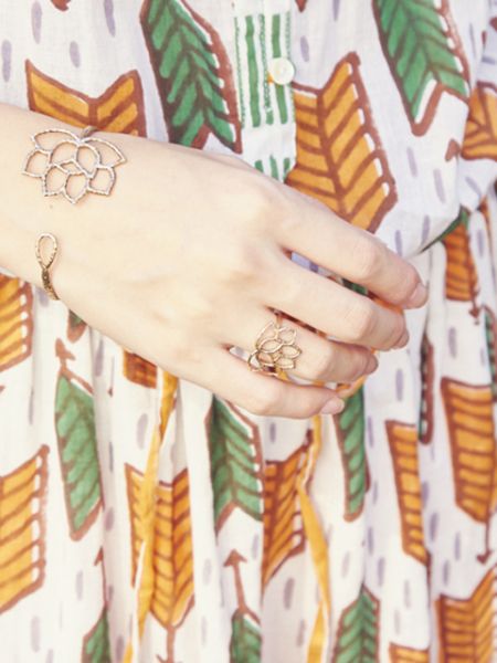 ロータスと象をメタルの線で描きました。凹凸感のある表面が光を受けて上品に煌めきます。大きめなモチーフなので、指を細く綺麗に魅せてくれます。