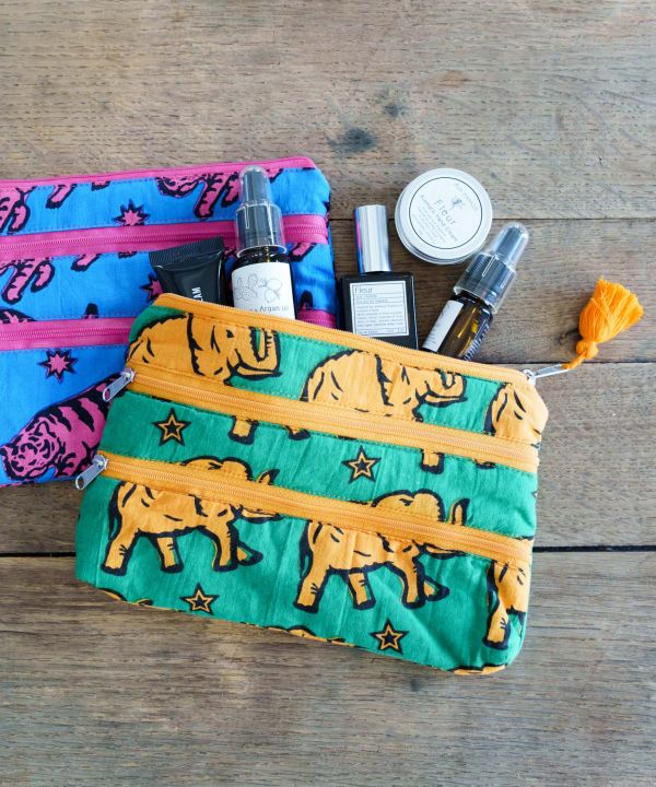 カラフルな動物がポップにデザインされたポーチ。小分けにしやすいファスナーポケットが2つ付いており、ちょっとした小物を収納するのに便利なサイズ感。ご自身用にはもちろん、ギフトにもオススメです。