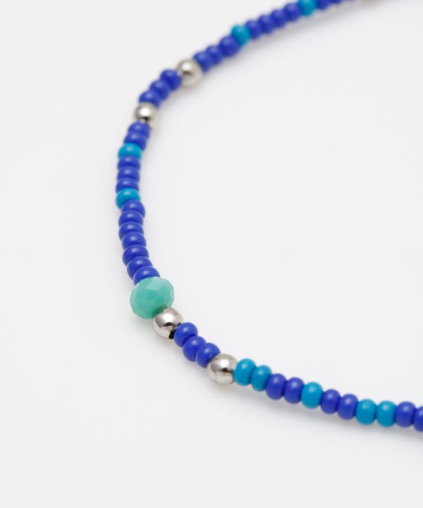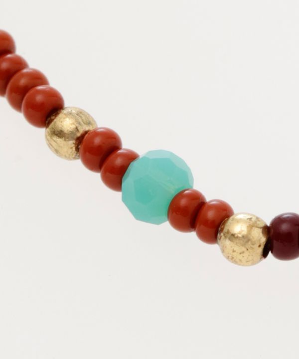 着けやすい華奢なビーズブレスレット。色あざやかなガラスビーズやメタルビーズの間に、ターコイズブルーのカットビーズがポイント。着脱しやすいゴムタイプ。シンプルに1本着けはもちろん、色違いで何本か着けたり、他のブレスレットや腕時計と重ね着けするのもおすすめ。