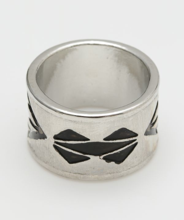 男らしく存在感のある幅太リング。中央のスタッズから刻まれる、力強いネイティブジオメ柄がポイントです。