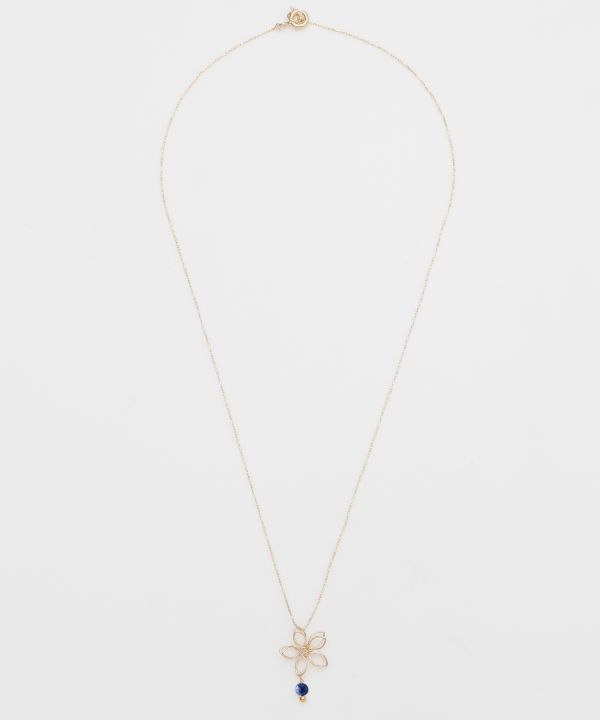 立体感のある花モチーフと、一粒石を合わせたネックレス。女性らしい、優しい印象を与えます。
