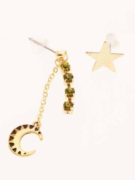 誕生月のオリジナルピアス。誕生石色のラインストーンが目を引く上品なデザイン。月と星のアシンメトリータイプ。片耳用のスタッドピアスとしても使いやすい。お好みのカラーで選んだり、プレゼントにもオススメ◎