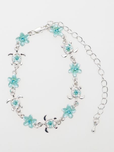 ホヌとプルメリアのブレス&アンクレット。ホヌモチーフだけでなく、プルメリアと合わせることでより一層、女性らしさが際立ちます。アジャスター付きでブレスレットにもアンクレットにもお使いいただけます。