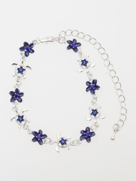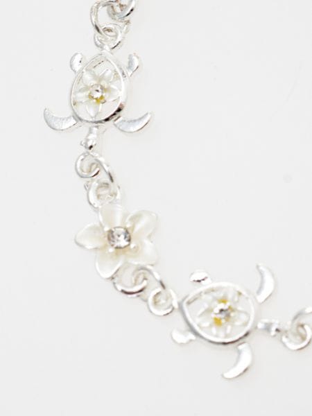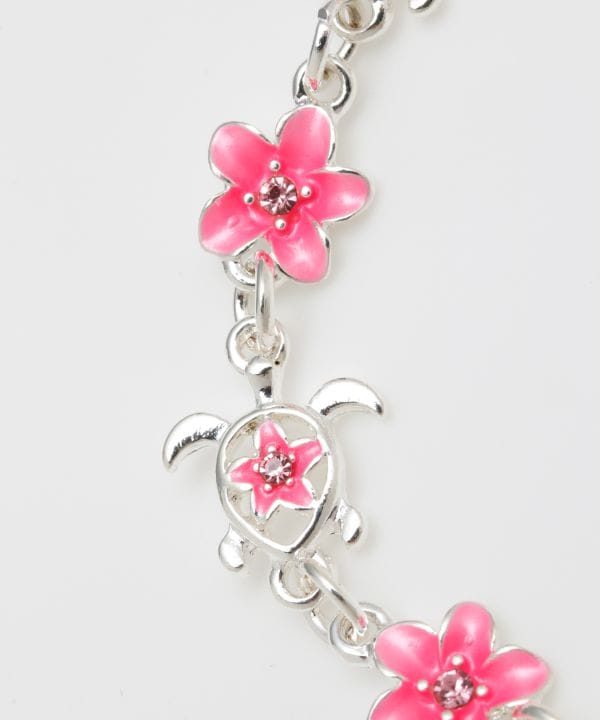 ホヌとプルメリアのブレス&アンクレット。ホヌモチーフだけでなく、プルメリアと合わせることでより一層、女性らしさが際立ちます。アジャスター付きでブレスレットにもアンクレットにもお使いいただけます。