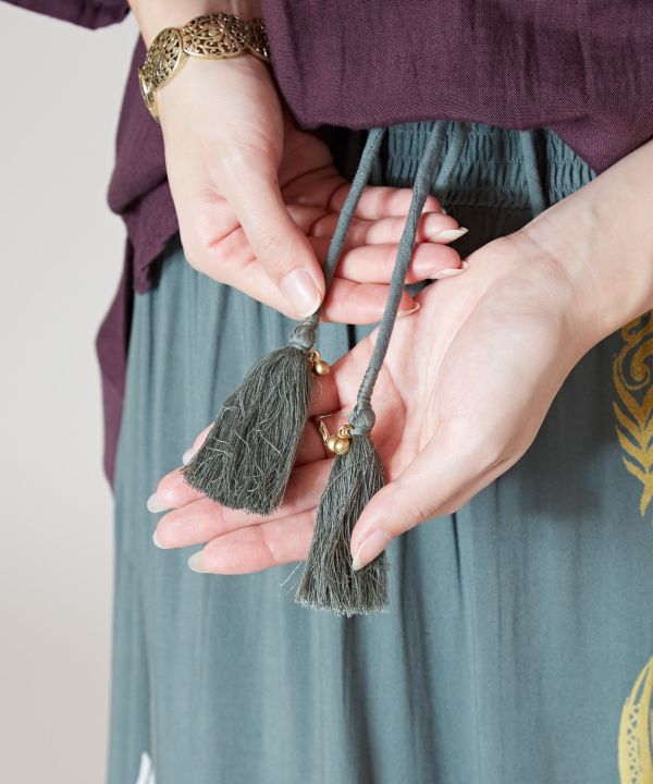 心奪われるトライバル柄。ウエストのシャーリング部分をバストまで上げることでチューブトップワンピースとしても使える2WAYスカート。渋めなカラーと、対角線上に描かれたトライバル柄がシャープさやクールさを演出。心地良いさらっとしたレーヨン素材。風に揺れるシルエットに胸が躍る。