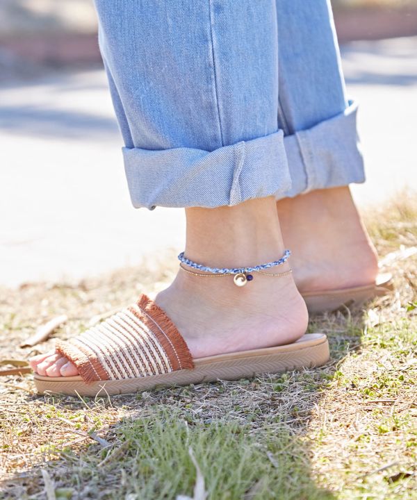 グラデーションがきれいなミサンガのアンクレット。波柄のチャームがポイント。台紙付き。