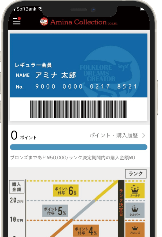 • ※アプリは会員証としてご利用いただけるほか、最新の商品情報、キャンペーンやセールのお知らせ、店舗案内、お買い物履歴や貯まったポイント、現在ランク、次のランクアップまでの状況など様々な機能を備えております。
