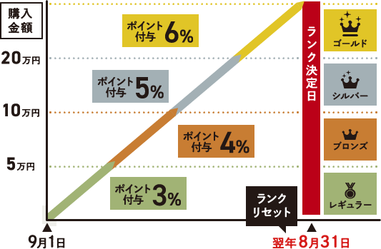 • ※9月1日〜翌年8月31日までにランクに応じた購入金額に満たない場合、翌年9月1日にランクダウンします。
